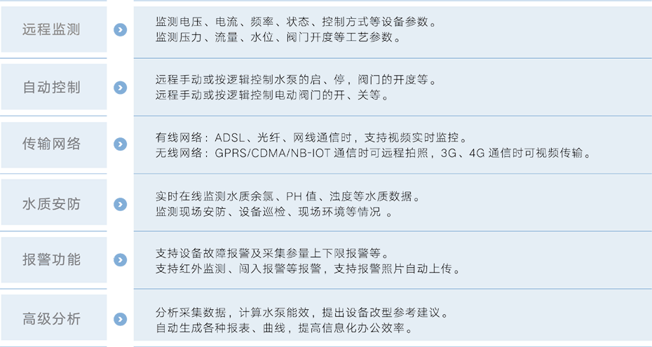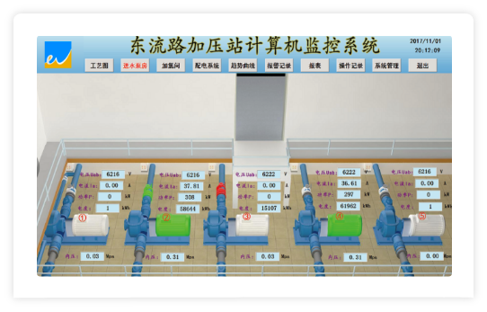 泵站遠程監控系統適用于城市供水系統中加壓泵站的遠程監控及管理。泵站管理人員在監控中心即可遠程監測泵站水池水位或進站壓力、加壓泵組工作狀態、出站流量、出站壓力等;可遠程控制、自動控制加壓泵組的啟停;光纖通信時,可圖像監視站內全景及重要工位,實現泵站無人值守。
